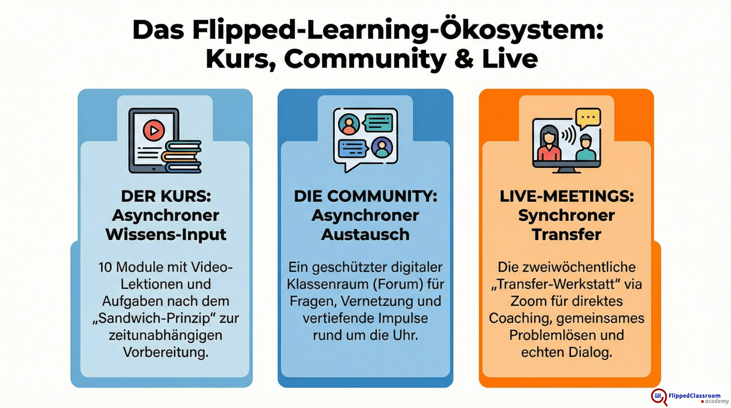 Hier an dieser Stelle klären wir jetzt das Wie. Denn dieser Kurs funktioniert anders als das, was wir oft gewohnt sind. Es ist kein bloßer Onlinekurs, den man ablaufen lassen kann. Es gehört die Community dazu, als Forum umgesetzt und klassisch textbasiert – als unser ruhiger, asynchroner Klassenraum. Und es gehören unsere Präsenzzeiten dazu, in denen wir miteinander so arbeiten, wie du es demnächst in deinem eigenen Flipped Classroom auch tun wirst. Der Kurs ist also keine Einbahnstraße, in der ich sende und du nur konsumierst. Wir schließen hier eine Arbeitsvereinbarung: