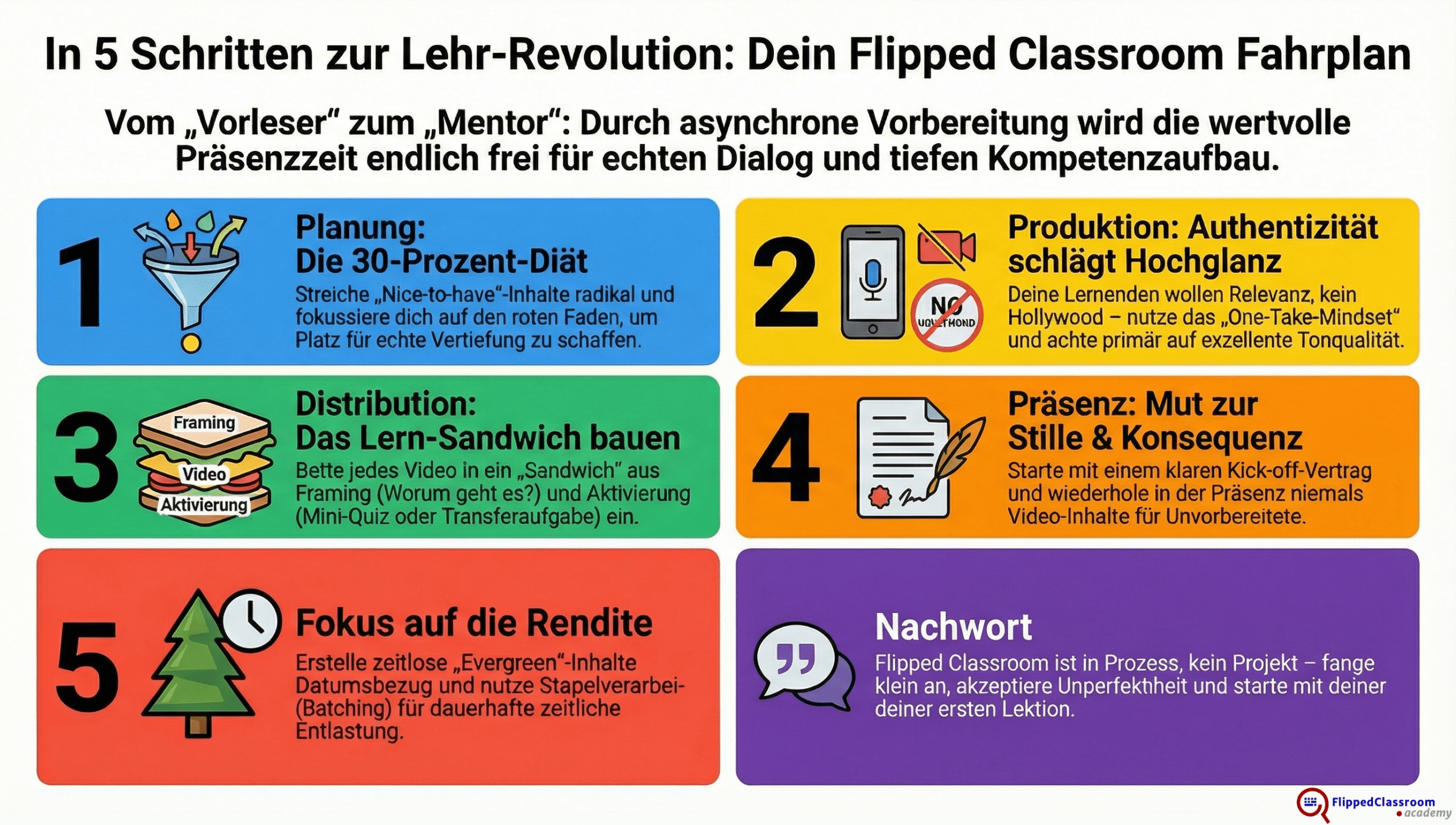 In den Kapiteln 1 bis 5 gehen wir die originären fünf Schritte unseres Konzeptes durch, von der ersten Planung über die Videoproduktion bis hin zum neuen Verhalten im Seminarraum.